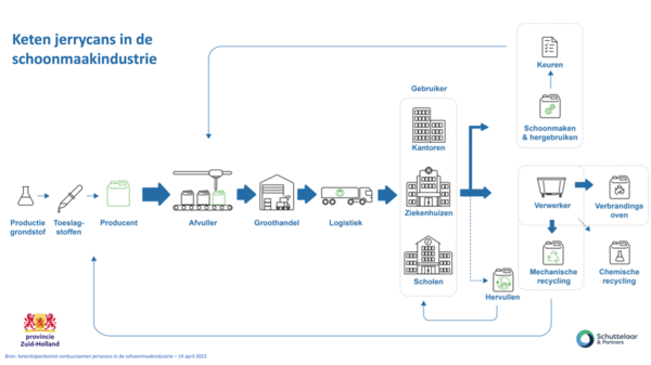 Jerrycans zijn gemaakt van de vrij zachte kunststof HDPE en goed recyclebaar. Helaas gebeurt recyclen in de praktijk nog weinig. Rondom deze stroom hebben we een netwerkbijeenkomst georganiseerd. In het geval van jerrycans voor de schoonmaakbranche ligt de oplossing iets ingewikkelder. We hebben eerst in beeld gebracht hoe er meerdere scenario’s mogelijk zijn als route naar circulair; van recycling tot hergebruik van jerrycans tot het vervangen van vloeibaar schoonmaakmiddel door een tablet (poeder), waardoor geen jerrycans meer nodig zijn.