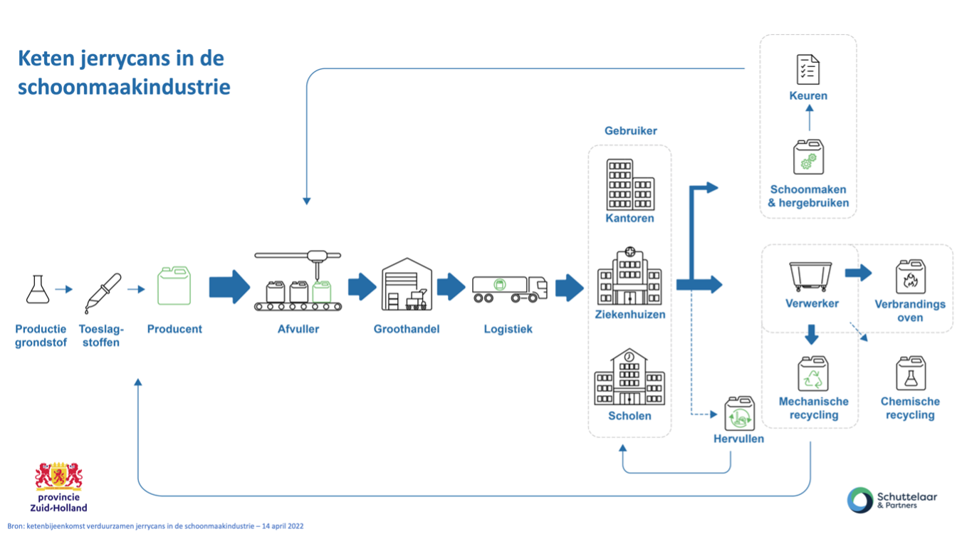 De ketens van de sectoren ‘havens en logistiek’, ‘bouw- en infra’ en ‘industrie en diensten’ zijn in beeld gebracht. Uit de laatste sector kwam dat jerrycans in de schoonmaakbranche de meeste potentie hadden. Er is samen gezocht naar alternatieven voor het verbranden van de jerrycans en daarna is er een ketenbijeenkomst georganiseerd. Het doel van deze bijeenkomst was het opzetten van keten gedragen pilots om de transitie naar een meer circulaire stroom voor de gekozen kunststof reststroom te realiseren. Een aantal ketenpartijen begeleid in een circo-track zijn met mogelijke oplossingen aan de slag gegaan.