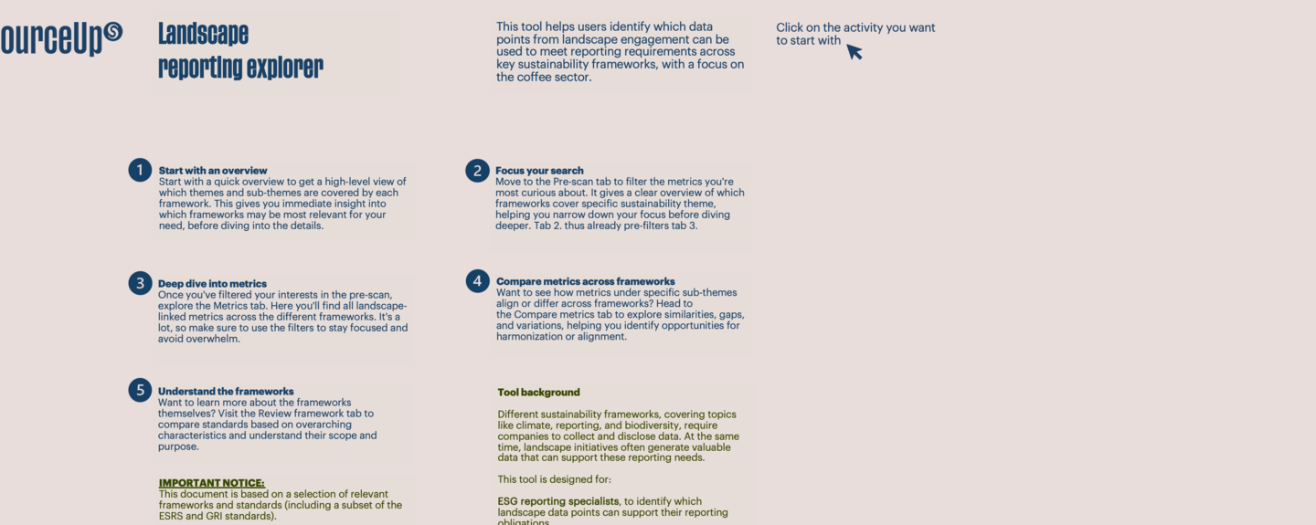 - SourceUp’s Landscape Reporting Explorer: een digitale tool waarmee bedrijven de indicatoren uit 11 belangrijke duurzaamheidsframeworks met elkaar kunnen vergelijken.