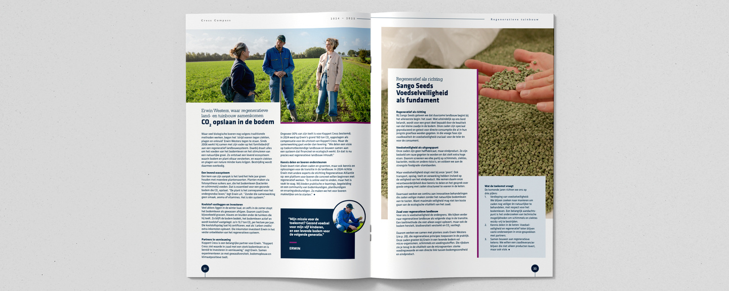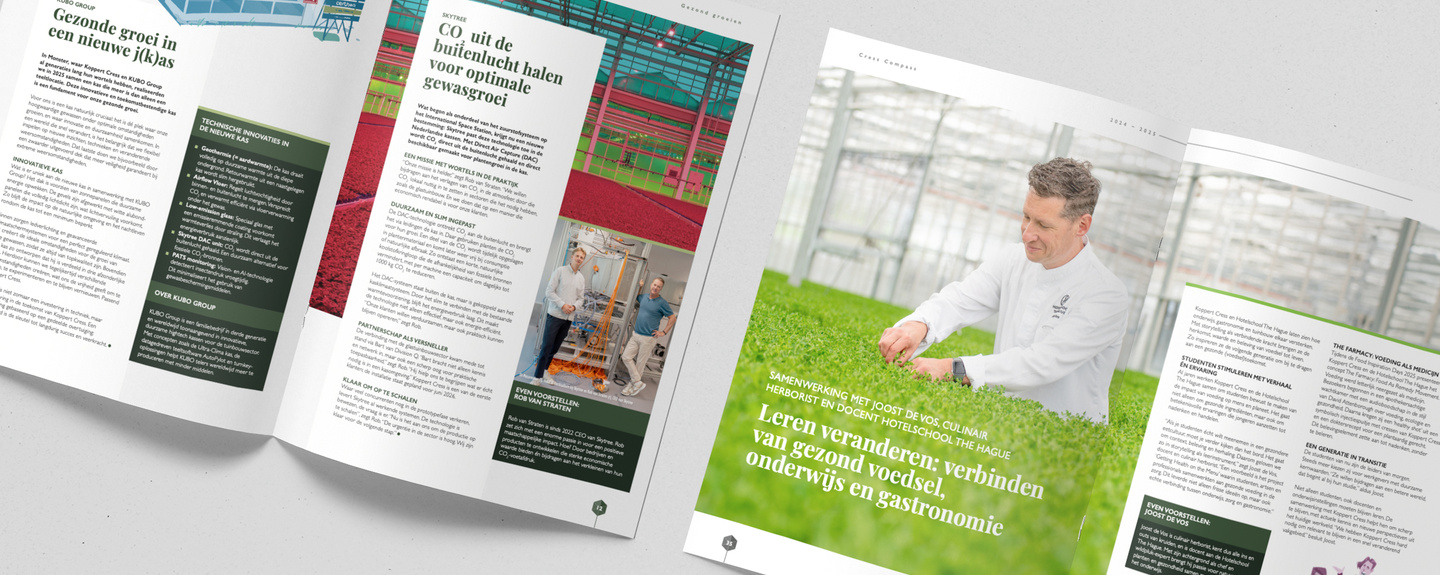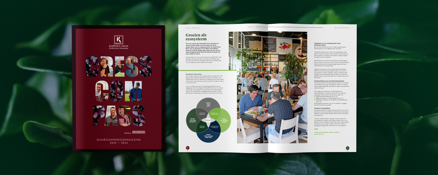 Het Cress Compass is uitgegroeid tot de basis van de duurzaamheidscommunicatie van Koppert Cress. Het magazine wordt zowel intern als extern gebruikt: op de website, tijdens beurzen en in corporate presentaties. Het helpt om mensen, data en strategie samen te brengen in één inspirerend en goed onderbouwd verhaal.