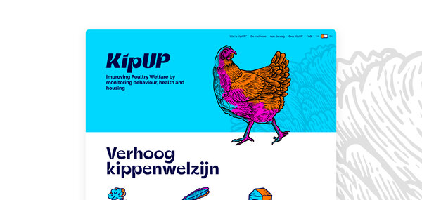 De methode focust op het verhogen van welzijn bij legkippen, dus de kip moest een centrale rol krijgen in de branding. De kernwoorden waren fris & modern, met een positieve insteek. Schuttelaar & Partners heeft met de naam KipUP gekozen voor internationaal bruikbare naam, waarbij ‘UP’ staat voor positiviteit, verbetering en vooruitgang. In het uiteindelijke concept hebben we felle kleuren gebruikt, zoals oranje, roze en blauw. Kleuren die opvallen, zeker in de pluimveesector. Het verenpak op de achtergrond verwijst naar de gezondheid van de kippen: hoe mooier het verenpak, hoe gezonder de kip!