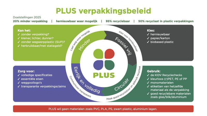 Wij bieden strategisch advies over verduurzaming van verpakkingen en ondersteunen op het gebied van communicatie naar klanten en eigen medewerkers. Zo heeft PLUS een verpakkingsbeleid opgesteld, die tot stand is gekomen met inbreng van de expertise van Schuttelaar & Partners. In het verpakkingsbeleid staan 4 doelen centraal: minder verpakking, hernieuwbaar waar mogelijk, recyclebaarheid verhogen en het verhogen van recyclaat in verpakkingen. Hiermee stelt PLUS hernieuwbaar centraal in het verpakkingsbeleid. Dit verpakkingsbeleid is leidend in de keuzes die PLUS maakt voor haar verpakkingen en innovaties daarop. PLUS besteed dan ook veel aandacht aan preventie, minder plastic en hernieuwbaar.