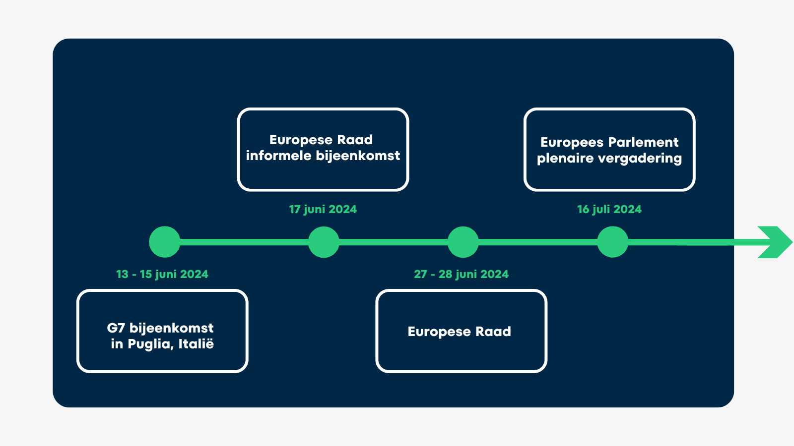 Deze week, van 13 tot 15 juni, komen de leiders van de G7 (waaronder von der Leyen, Scholz, Michel, Macron en Meloni) bijeen in Puglia, waar informele discussies tussen de leiders te verwachten zijn. Volgende week maandag, 17 juni, komt de Europese Raad bijeen voor een informele bijeenkomst.