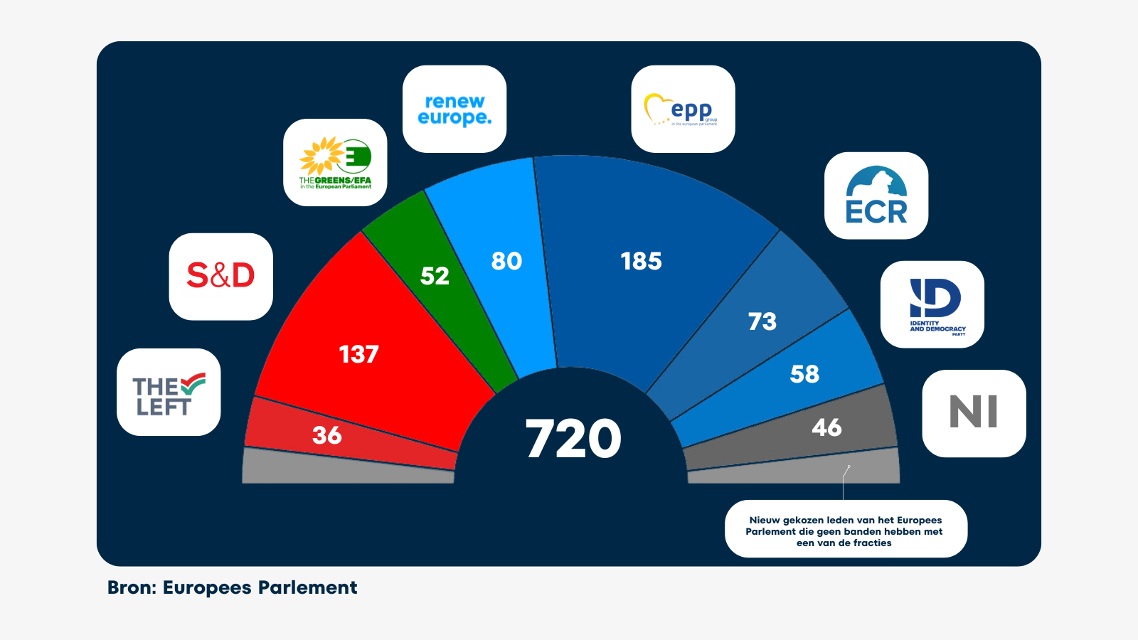 *Let op: alle cijfers in dit stuk zijn gebaseerd op de informatie die op het moment van schrijven van dit artikel beschikbaar is op de officiële website van het Europees Parlement en kunnen de komende dagen veranderen als het tellen van de stemmen is afgerond. Bron: https://results.elections.europa.eu/nl/